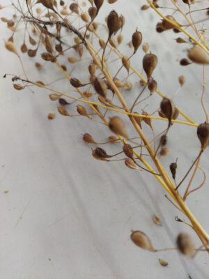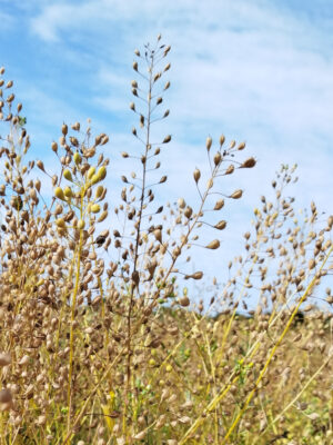 La camelina mostra non solo ottime caratteristiche agronomiche, ma anche una composizione unica dei suoi semi con un contenuto rilevante di olio (40-42%) e proteine (25-28%), accompagnato da un profilo acido di alta qualità. Quest’ultimo è rappresentato da più del 50% di acidi grassi polinsaturi (PUFA), di cui i più rappresentativi sono l’acido α-linolenico (C18:3, ω-3) e l’acido linoleico (C18:2, ω-6). Il rapporto tra i due (ω-3/ω-6) rende l’olio di camelina adatto per l’integrazione nella dieta in quanto in grado di apportare benefici alla salute umana.