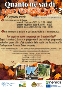 Se sei uno studente del secondo e terzo anno delle lauree triennali (Scienze agrarie; Viticoltura ed Enologia) e del secondo anno delle lauree magistrali (Biosicurezza e Qualità degli Alimenti; Sistemi Agricoli Sostenibili; Biotecnologie Vegetali e Microbiche; Progettazione e Gestione del Verde Urbano e del Paesaggio), o frequenti uno di questi corsi da fuoricorso, il Dipartimento di Scienze Agrarie, Alimentari e Agro-ambientali (DiSAAA-a) dell’Università di Pisa ti offre la possibilità di partecipare all’evento residenziale dedicato all’acquisizione delle competenze per la sostenibilità attraverso l’approccio del